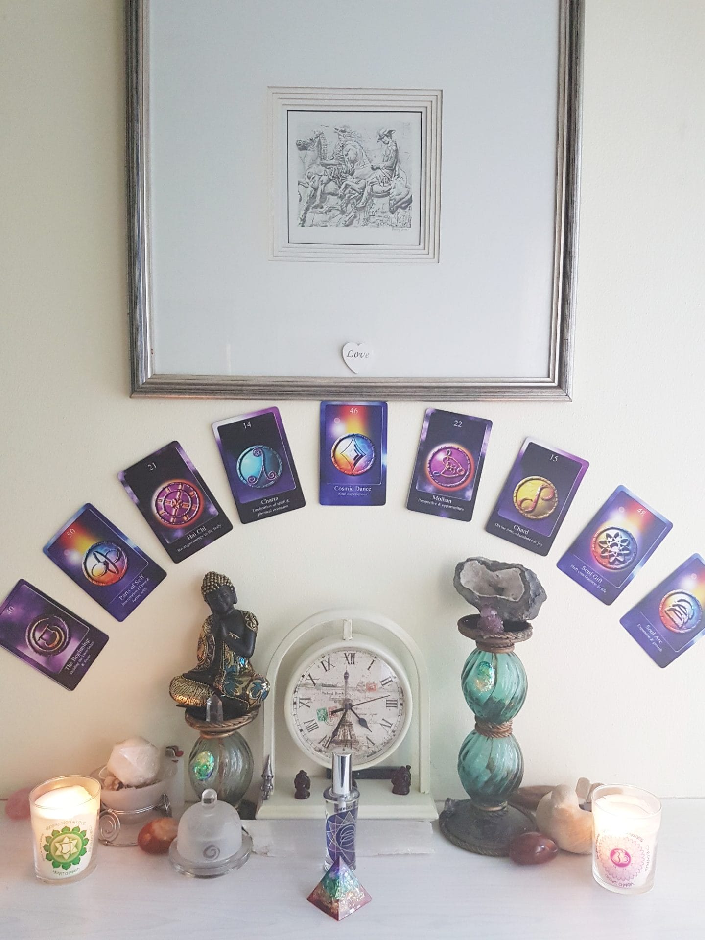 My sacred alter includes the very first drawing I ever did, together with some of my Infinity Keys (I chose them carefully for the energy I would like to invite), a clock (because I work with Time in the Antaneea treatment) and crystals (because they enhance and amplify everything)